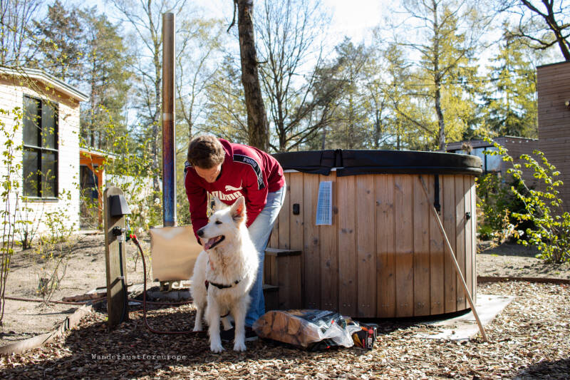 Voor wie niet weet wat een hottub is: een hottub is een vaak rond bad gevuld met water. Het water kan je warm/heet maken door vuur te maken in de daarvoor bestemde kachel. Via de pijpen die aan de kachel vastzitten wordt de warmte dan afgevoerd naar het bad en zo warmt je water heerlijk op. De temperatuur kun je zelf bepalen. Hieronder zie je de hottub van Tiny house July.